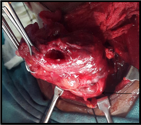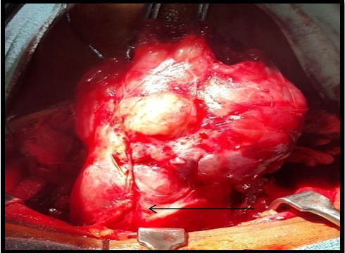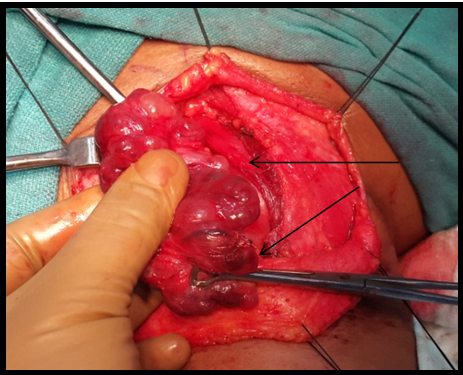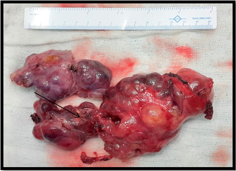 Figure 5A Multiple nodules on the surface of thyroid gland (arrow). Both the lobes dissected out after preserving parathyroid’s and RLN.
