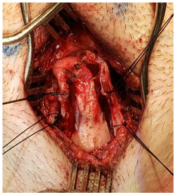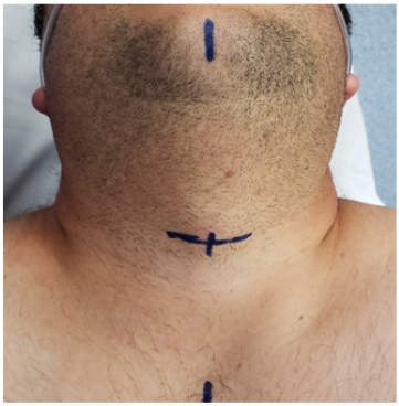 After positioning the patient, the thyroid cartilage is palpated so that the incision site can be designed. The midline is also marked on the chin, neck and sternal furcula. The incision should be horizontal with about 3-4 cm, being more extended to the side where the surgery will be performed. After dissection by planes, thyroid cartilage should be widely exposed.4