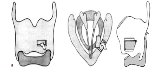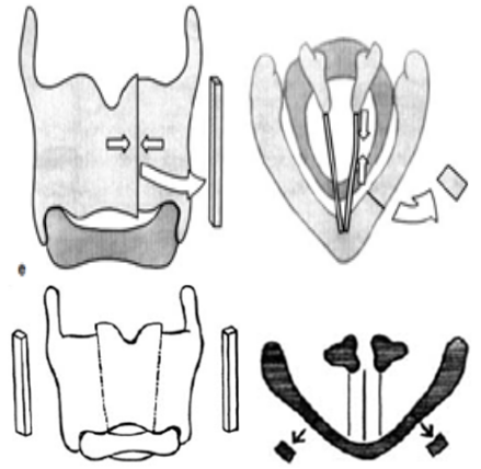 In this type of surgery, in cases of medial approach, after exposure of the thyroid cartilage, implants are used and flaps are made in the middle portion of the thyroid cartilage. Both techniques aim to increase tension in the vocal folds.