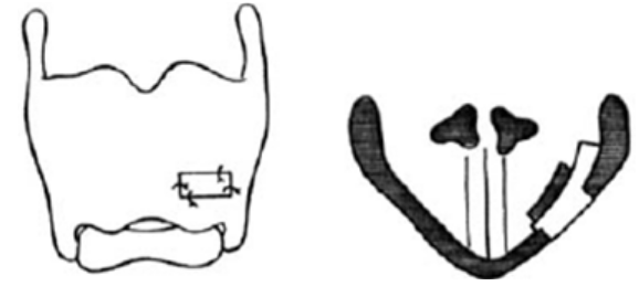 The exposure of the thyroid cartilage is performed in the same way as other aforementioned thyroplasty. A vertical cartilage tape (about 3-4mm) is outlined at the junction of the anterior third with the middle third of the lateral blade of the thyroid cartilage (about 7mm distance from the midline). This procedure can be performed unilaterally or bilaterally.2,14 After removing the cartilage tape, two sutures of the remaining portions of the thyroid cartilage are performed for better correction.14