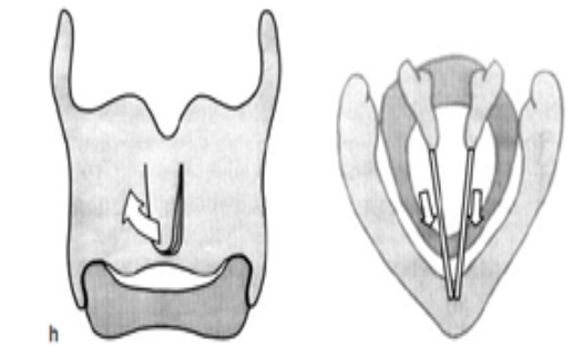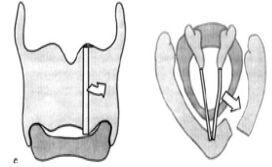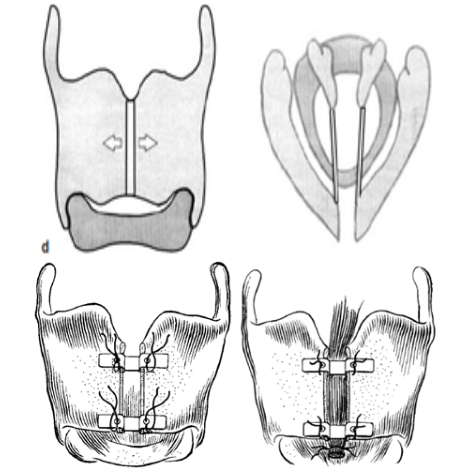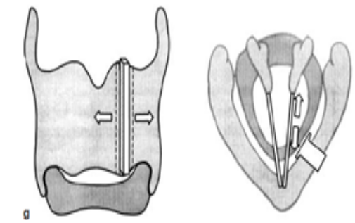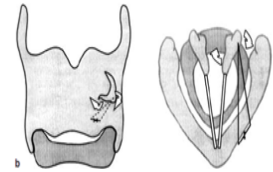 The exposure of the thyroid cartilage is done similarly as in medializationthyroplasty. A vertical incision is made in the lateral lamina of the thyroid cartilage and the fragment is mobilized, increasing the glottic space.