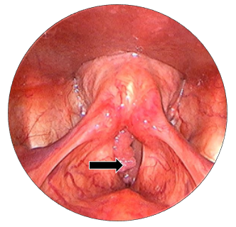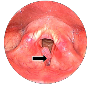 Figure 4 Microlaryngoscopic view of the true vocal folds. Black arrow: papillomatous lesion over right anterior 2/3rd aspect of vocal fold.