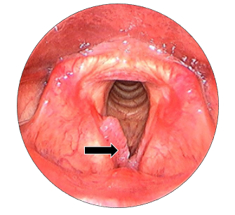 The papilloma manifests as an exophytic; branched, pedunculated, or sessile mass, single or several, that is most commonly found on the true vocal folds. Other areas of the laryngeal mucosa may be impacted as well.