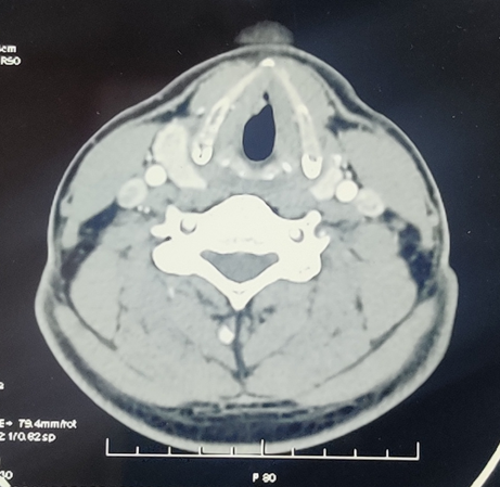 A twenty four years old male patient attended our Apollo ENT Hospital at Jodhpur, Rajasthan with complaint of changes in voice for six to eight months. There was no history of vocal abuse. By profession he was a food delivery guy. There was no history of difficulty or pain while swallowing. He denied any discomfort while breathing. There was no history of recurrent fever, nausea, vomiting, loss of weight or loss of appetite. He had no history of smoking, alcohol consumption, or chronic respiratory diseases. There was no history of blood stained sputum. He had no history of sexual promiscuity or genital warts.
