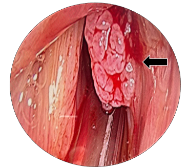 Although it can affect any area of the larynx, squamous papilloma commonly develops along the true and false vocal folds. It may appear as a single lesion or multiple lesions, with the latter being more prevalent in children and linked to recurrent respiratory papillomatosis (RRP).3 This illness is frequently connected with human papillomavirus (HPV) infection, particularly HPV types 6 and 11, which can affect the upper digestive tract as well as the entire respiratory tract.1–3 Hoarseness, dysphonia, stridor, dyspnoea, and cough are the most common clinical symptoms of squamous papilloma. Laryngoscopy and histology are used to make the diagnosis. There are various treatment options available, including as, laser surgery, surgical excision, antiviral therapy, electrocautery and cryosurgery.2–4 particularly in cases with multiple lesions and in children, the recurrence incidence is significant. Additionally, in roughly 20% of adult cases, malignant transition to squamous cell carcinoma has been documented.4 Recidivism, on the other hand, has been the most prominent event in its evolution. Additionally, obstructive laryngeal papillomatosis poses a life-threatening risk, making a rescue tracheostomy necessary.5