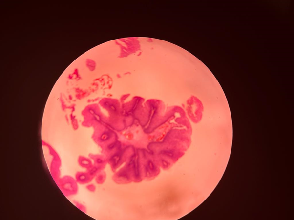 A histological examination of the specimen was requested. According to the histology report, a papillomatous lesion comprised of multiple finger like fronds with a central fibrovascular core covered by benign hyperplastic stratified squamous epithelium. Basal and parabasal hyperplasia noted. Koilocytic changes noted in upper layers. There was no evidence of dysplasia or malignancy. Overall features suggestive of squamous papilloma. (Figure 6A-D) The postoperative course was uneventful. The patient was discharged on the next day of surgery with oral antibiotics and analgesics. He was advised to avoid voice strain and to drink plenty of fluids. He was followed up at one week, one month, three months, and six months after surgery. He reported significant improvement in his voice quality and had no complaints of hoarseness or dysphonia. Laryngoscopy showed normal healing of the surgical site and no recurrence of the lesion. The patient was advised to continue regular follow-up for at least two years.