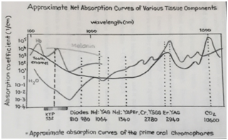 Erbium Laser: Two separate wavelengths form the Erbium ‘family’, Er, Cr: YSGG (Yttrium Scandium Gallium Garnet) lasers and Er: YAG (Yttrium Aluminium Garne) lasers.6 Preferred laser for dental hard tissues as it has greatest absorption of water. It can also be utilized for soft tissue ablation.13