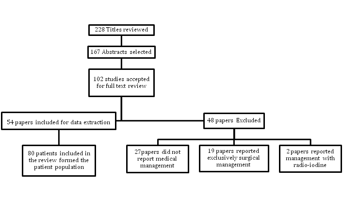 Two-hundred twenty-eight titles of articles were reviewed. One-hundred sixty seven abstracts of the papers that had accepted titles were reviewed. Sixty five abstracts were excluded, as no medical treatment was discussed, and 102 full text articles were selected. Subsequently, 54 full text articles met our inclusion criteria. Forty eight articles were excluded (the list will be provided upon request from the corresponding author). Management of lingual thyroid exclusively by surgical excision was reported in 39% (19/48) of the studies. Other reasons for exclusion were: no medical treatment initiated because of minor symptoms (10articles) or no cases discussed or patient condition mentioned (17articles). Two papers reported treatment with radioiodine 131 (Figure 1).