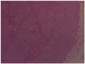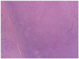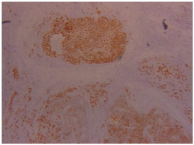 The pathology report revealed presence of lymphoepithelial carcinoma of the right parotid gland with positive lymph nodes from specimens taken. Upon performing pathological studies, the sample excised was stained with hematoxylin and eosin stain (Figure 3) which showed lymphocytic infiltrates invading the parotid gland, EBER stain (Figure 4) showed positive results for presence of Epstein bar virus. The excised lymph nodes were also stained (Figure 5), and metastasis was found.
