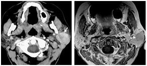 Figure 7 Axial contrast enhanced CT, and axial gadolinium enhanced T1 weighted imaging of malignant salivary gland tumor.5