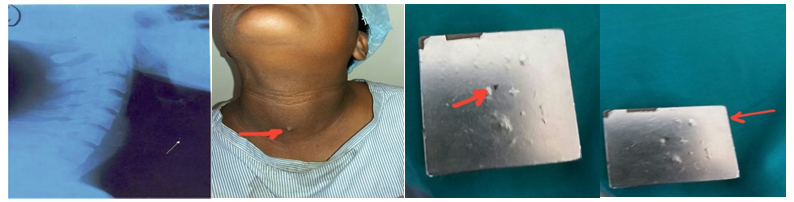 Considering the morbidity and mortality associated with surgical exploration.6,7 Removal of foreign bodies which break up into fragments such glasses, shotgun pellets etc. is more difficult as there are chances of some fragments being left Organic foreign bodies like the piece of branch of tree are grossly contaminated and can cause serious infection if not removed promptly and not treated with adequate antibiotic coverage . so in this case were metallic foreign body get stuck in to neck we advised the patient to use strong metal use over period for avoiding neck exploration surgery to remove it and foreign body itself will come to skin surface with help of strong magnet and yes its came to surface and get removed