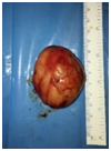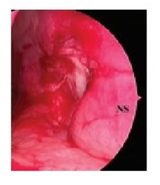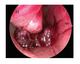 The other local and systemic examinations were unremarkable. CT PNS was performed and revealed a soft tissue density arising from the nasal septum without any involvement of the sinuses. The mass was excised endoscopically under local anesthesia A rolled gauge soaked in a solution of 4% xylocaine with one ampule of adrenaline was placed all around the mass. The anterior septum area around the attachment of the mass was then injected with 2% xylocaine with adrenaline.