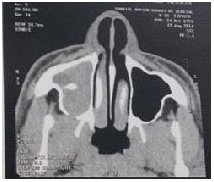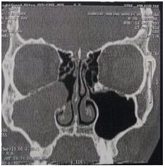 Figure 1 Coronal TC of the paranasal sinuses showing maxillary opacification with extension to nasal cavity, involving the medium turbinate.