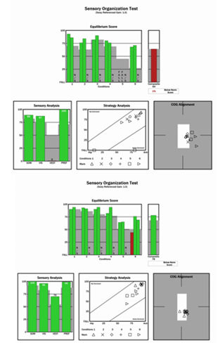 Figure 1 (Top) Initial evaluation Sensory Organization Test of the computerized dynamic posturography measures vestibular pattern of disequilibrium. (Bottom) Follow up posturographic data reveals a normalized pattern of postural stability indicative of central compensation.