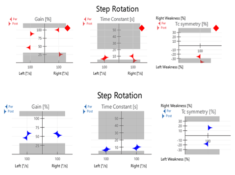 Kinetic rotary chair testing was performed using step velocity stimulus at 100 degrees/second to evaluate mid-frequency vestibulo-ocular reflex function; Figure 2 VOR responses to step velocity stimulation bidirectionally revealed reduced gain in predominantly left ear driven response conditions (left per and right post). This also resulted in abnormalities and asymmetries in time constant measurements. Results may be indicative that the patient remains non-compensated at mid-frequencies of the vestibulo-ocular reflex. Post rehabilitation measurements demonstrate compensation of the mid-frequencies with stabilized gain values and borderline reduced time constants.