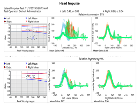 Figure 3 (Top)Video head impulse test at initial evaluation shows asymmetries with leftward head thrusts yielding significantly reduced VOR gain and corrective saccades. (Bottom) Repeat testing at follow up showed improved gain values and remission of corrective saccades.