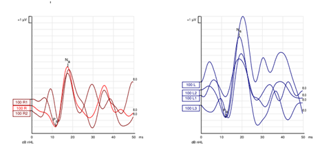 Figure 4 cVEMP recordings reveal symmetrical latency and amplitude measurements with robust waveform morphology.