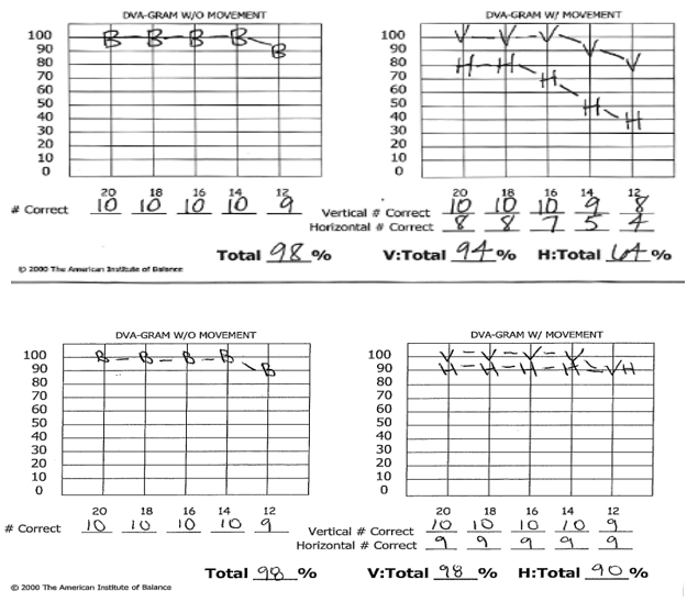 Figure 5 (Top) Initial evaluation with American Institute of Balance Computerized Dynamic Visual Acuity Test (AIB-CDVAT) shows significant decrease in visual acuity with head movement in the horizontal plane. Of note, visual acuity with vertical head movement is intact. (Bottom) Post treatment assessment of dynamic visual acuity with AIB-CDVAT shows improvement in horizontal plane. Results are now negative for clinically significant oscillopsia.