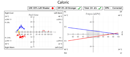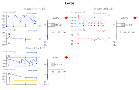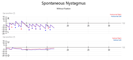 Results of Video-Nystagmography (VNG), revealed pendular, randomized pursuit and bi-directional optokinetic reflex testing and all within normal limits indicative of intact ocular motility. In vision denied, a spontaneous right beat nystagmus was observed. This nystagmus was direction fixed and enhanced in accordance with Alexanders Law; Figures 6&7. It also enhanced post high frequency head shake and suppressed with visual fixation. Modified Hallpike (mHallpike) testing revealed an upbeat rotary torsional, geotropic nystagmus which fatigued in 15 seconds in the left positioning, consisted with left ear PC-BPPV. Positional studies were otherwise unremarkable for any clinically significant nystagmus. Bithermal caloric air irrigations yielded a significant left unilateral weakness of 83%. Fixation index was intact; (Figure 8).4–10
