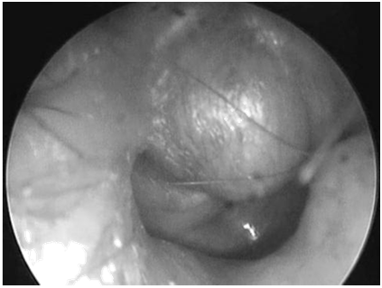 In October 2010, a 48-year old man presented at our otorhinolaryngology department with a 3-month history of right hearing loss, tinnitus and aural fullness. The otoscopy revealed a gray-white nonpulsatile poster superior retro tympanic mass with intact tympanic membrane (Figure 1). The hearing test confirmed a mild conductive hearing loss. A high-resolution temporal CT showed a well-circumscribed soft-tissue mass in the epitympanic area that was embedded in the ossicles without evidence of bone erosion (Figure 2). MRI revealed a middle ear mass with low intensity on T1weighted images, high intensity on T2-weighted images, and enhancement after administration of gadolinium.