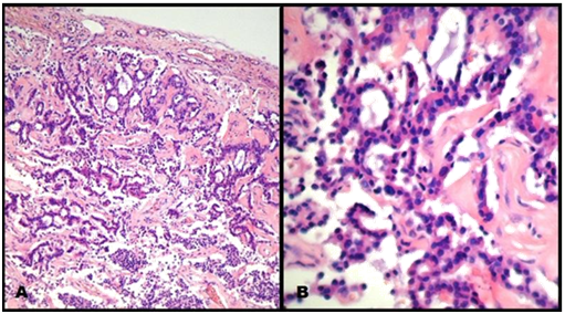 Microscopically, different architectural patterns can be found, including glandular, trabecular, solid, organoid, and infiltrative. The architecture varies between tumors and even within the same tumor, with most of the samples displaying more than one pattern. The tumors are predominantly composed of cuboidal-to-columnar cells with eosinophilic cytoplasm and eccentric round to oval nuclei. The chromatin tends to display a “salt-and-pepper” pattern consistent with the usual neuroendocrine origin. Mitoses are essentially absent.5,6 The tumor cells are immunoreactive with a variety of keratin antibodies (cytokeratin (CK) cocktail, CK7, and CAM 5.2) and neuroendocrine markers including chromogranin, neuron-specific enolase, synaptophysin, vimentin and serotonin.5‒10