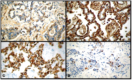 Histologic examination of the excised tumor showed an epithelial neoplasm predominantly composed of cuboidal-to-columnar cells with eosinophilic cytoplasm and round to oval nuclei. The cells were disposed forming trabecular, glandular and solid patterns (Figure 3). The histological morphology of the tumor was informed as compatible with MEA. A posterior immunohistochemical evaluation showed positivity for enolase, synaptophysin, vimentin, protein S100, cromogranin and cytokeratin. These findings confirmed the diagnosis of a MEA with neuroendocrine differentiation (Figure 4). The patient is currently disease free.