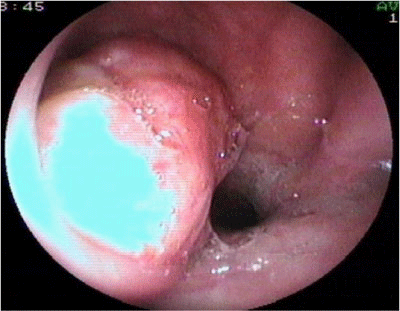 Figure 1 Endoscopic view through the right nasal cavity of a Pleomorphic Adenoma arising in the right lateral wall of the nasopharynx.