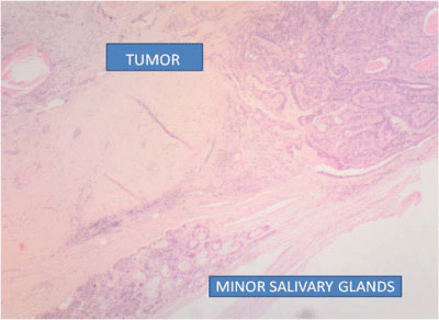 Figure 4 Microphotograph of a tumor showing a mixture of epithelial, myoepithelial and stromal components with normal minor salivary glands and a thick layer of fibrous tissue typical of minor salivary glands Pleomorphic Adenoma. Hematoxylin/eosin staining.