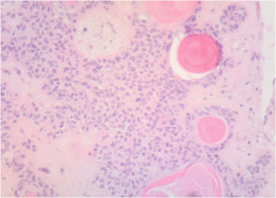 Figure 5 Intravascular deposits of cells and eosin positive myxoid material mimicking keratin nodules as described in some epidermoid carcinomas. Hematoxylin/eosin staining.