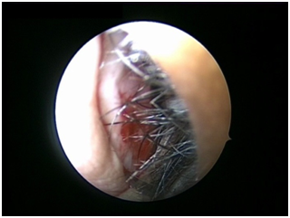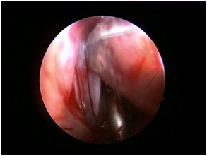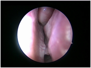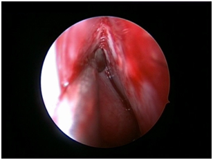 Nasal Endoscopy is done to assess the septal deviation and spurs (Figure 1) ( Figure 2). Septal infiltration is carried out with a solution of 2% Xylocaine with 1: 100,000 adrenaline in the sub-mucosal plane. It is given with a single prick at the inferior most part of the nasal septum at the junction of the septum with the floor of the nasal cavity anterior to the mucocutaneous junction. The infiltration is given at the same point on both the sides (Figure 3). The incision is always given on the deviated side. It is given anterior to the mucocutaneous junction because the skin present at that place is thick and chance of a tear of the flap is less (Figure 4). The mucoperichondrial flap is raised on the deviated side with a Freer’s elevator strictly under vision. The flap is not to be raised beyond the deviated part because the part of the septum posterior to the deviation is not under direct vision (Figure 5) (Figure 6). The caudal end of the septum is then palpated and an incision is given on the cartilage 1cm behind the columella. This 1cm of the cartilage is saved to prevent post operative tip deformities (Figure 7). The cartilage is sliced and the opposite side is entered, the mucoperichondrial flap of the opposite side is then elevated with a Freer’s elevator. A cut is given in the septal cartilage as high as possible. A septal window is created and a Ballenger’s swivel knife is taken and lodged in the place where the cartilage was cut. Creation of a septal window thus increases the area of exposure (Figure 8) (Figure 9). The flap on the non-deviated side is elevated till the bony-cartilaginous junction.