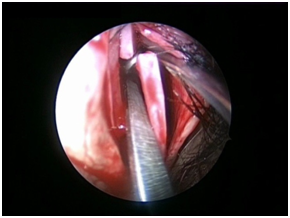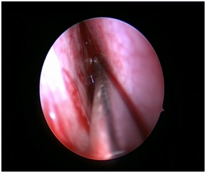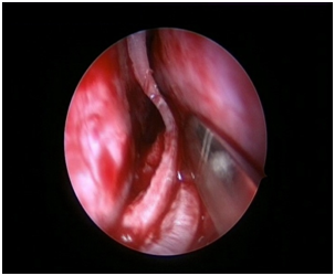The nasal cavities are packed on both the sides with ribbon gauze soaked in a solution of 1:1000 adrenaline using a 0 degree, 4 mm, 18cm wide angled endoscope ( Karl Storz).