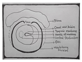 Modified Rosen’s incision was given in canal skin as described in fig. leaving anterior skin as vascular strip which meets posteriorly to meatotomy incision. Tympanomeatal flap elevated all around along with 360 degree elevation of annulus after denuding handle of malleus. . Anteriorly annulus is lifted up from its sulcus and the anterior canal wall skin elevated using a circular knife from medial to lateral direction and Tympanomeatal skin reflected anteriorly by laterally based anterior skin flap between 2 to 4 o’clock for right ear. This way medial part of bony canal wall is visible all around. Any drilling to reduce anterior, inferior canal hump is done. Graft is placed all around over bony meatal wall medial or lateral to handle of malleus. Tympanomeatal flap is reposited back over graft maintaining anterior angle. No gel foam was placed in middle ear as graft is well supported all around. EAC packed with medicated gel foam and wound sutured (Figure 1).