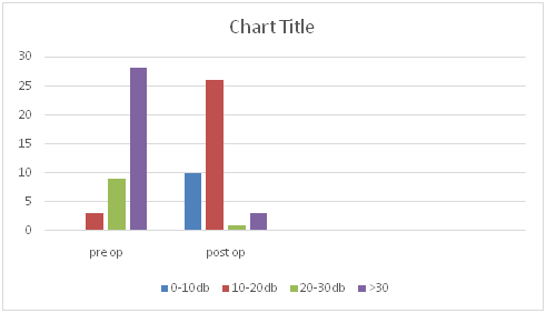 Patients were classified on the basis of degree of hearing loss. Patient were categorized in 4 groups less than 10 dB loss, 10 to 20 dB loss, 20 to 30 dB loss and more than 30 dB loss. In all the cases only conductive hearing loss was recorded in pure tone audiometry. Bone conduction up to 5 decibels is considered as test error and was not taken into consideration.