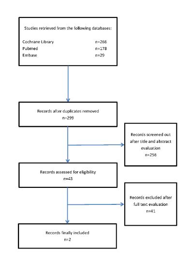 The initial search retrieved 266 records from PubMed, 178 from Embase and 29 from Cochrane lib. After ruling out duplicate records by importing the search results into Endnote software version 7, 299 records were left. 256 records were excluded after initial title and abstract evaluation, leaving 43 for full-text evaluation. Finally, one RCT and one retrospective cohort study were included for analysis (Figure 1). An ongoing multicenter randomized trial comparing IM nails and plate fixation (IMPRESS) was found on the website of clinical trials. The authors were contacted for the current progress of the study. Unfortunately, this study was still in the stage of case enrollment, and no data was available for the moment.