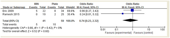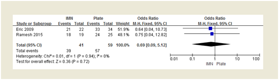 The RCT found no clear advantage of either technique in infection rate, with 0% of infection in the IMN group and 8% in the plate group. In the retrospective study, the overall infection rate was similar in IMN and plate groups (23% and 24% respectively), but there were a higher percentage of open fractures in the IMN group. Further analysis according to open and closed fractures showed that the two techniques had the same infection rate (33%) for open fractures. And pooled results, again, found no statistical difference in infection rate between the two methods (Figure 4). Rate of implant removal because of discomfort or pain after plating was 3times higher than that after IMN fixation.