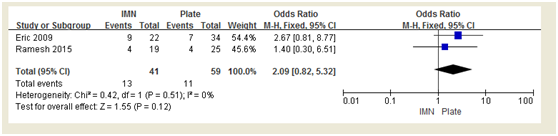 Interpretation: The meta-analysis of the current study found similar union rate, mal-union rate and infection rate for IMN and plate. IMN was more patient satisfactory, but at the same time, more technically requiring. However, the final conclusion that IMN and plate had the same outcome in treating proximal tibial extra-articular fractures should still be made with caution, because of the relatively small sample size of this systematic review.
