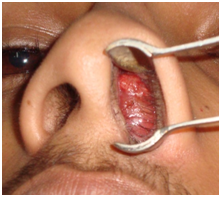 All the patients underwent endoscopic excision under anaesthesia. After the administration of local anaesthesia, the mass was excised using nasal endoscope, and its base was cauterized to control bleeding (Figure 6) (Figure 7). The patient's postoperative course was uneventful.