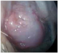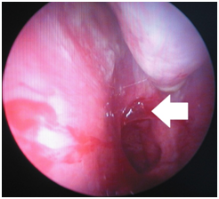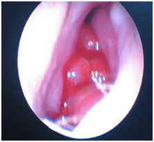 All the patients underwent diagnostic nasal endoscopy under local anaesthesia. Mass was attached to anterior part of the nasal septum in 23 patients (Figure 1) (Figure 2) and in 4 patients, it was arising around the choana (Figure 3).