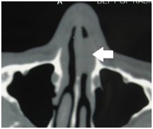 Figure 4 CT scan picture showing soft-tissue mass [arrow] in the anterior part of the left nasal cavity.