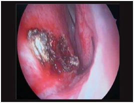 One of the male patients who was 55 year old presented to us with an unusual presentation. He had 5 to 6 episodes of epistaxis for the past 6 months for which no medical care was taken as it was mild. One day following sneezing, the patient had epistaxis and saw a mass coming out of his left nostril. Endoscopic examination showed that mass was arising from the posterior end of the left nasal cavity (Figure 5).