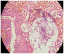 The mature phenotype of the organism includes a thick walled spherical structure termed sporangia containing smaller spherical structures termed sporangio spores.The characteristic strawberry-like appearance of the mass is attributable to the presence of mature sporangia. Microscopically, the involved tissue shows, numerous sporangia in various stages of development whose diameter is ranging from 10 to 300μm.The larger lesions are closer to the mucosal surface. Whereas the sporangiospores ranges from 2 to 5μm in diameter. The lesions are surrounded by an intense inflammatory reaction consisting of lymphocytes, plasma cells and eosinophils.5,6,8