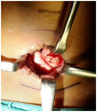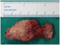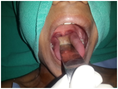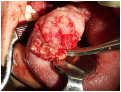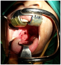 A 14 year old male presented with complaints of dysphagia for one year. On examination, a pinkish irregular growth approximately 3.5cm in transverse diameter was seen in right side of base of tongue. It was immobile, nontender, firm, and non compressible swelling which was blanching on pressure. Rest of the ENT examination was normal. A MRI scan was done and suggestive of mass epicentered in posterior 1/3 of tongue mainly on right side, crossing mid line with size of 20 X 29 X 34mm and infiltrating the intrinsic muscles of the tongue. It was heterogeneously hypointense on T1W1 and heterogeneously hyperintense in T2W1 images. Delayed post contrast enhancement was noted and provisional diagnosis of Haemangiolymphangioma was given. The patient was given empirical treatment with oral propanolol and local sclerosant (phenol) injection. However, there was no decrease in size of the mass and decision was taken for surgical excision. The patient was taken up for coblation assisted surgery under general anaesthesia. The upfront tracheostomy was offered to secure the airway and to avoid any postoperative complications after obtaining informed consent.