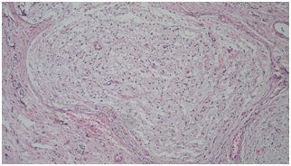 Histopathological examination of excised mass was suggestive of histomorphological features suggesting plexiform neurofibroma. The mass consisted of bundles of expanded nerve branches, limited by peripheral rim of eosinophilic membrane. The constituent cells were spindle shaped, with wavy serpentine nuclei. The matrix was composed of fibrocartilagenous tissue with scattered lymphocytic infiltrate.