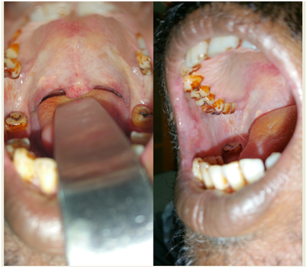 A 34 year old male patient presented with complaints of burning sensation in the mouth for 2 years and progressive difficulty in opening the mouth since 1 year. He had been chewing areca nut along with tobacco for past 5 years. On examination the patient had trismus with mouth opening of only 2.2 cm and poor oral hygiene. The oral mucosa was pale with multiple thickenings across the palatal and buccal mucosa suggestive of fibrous bands (Panel A). The patient was treated with submucosal injections of triamcinolone and hyaluronidase every week for 6 weeks and was advised to stop chewing tobacco and areca nut. His symptoms gradually improved and the mouth opening improved to 3 cm at the end of 6 weeks. There has been no progression in the symptoms at 3 months of follow up. Oral submucous fibrosis (OSF) is a chronic, progressive, insidious, irreversible disease of the oral cavity characterized by fibrotic change and severe burning sensation with restricted opening of the mouth. It was first described by Schwartz, which he called “atrophia idiopathica mucosae oris.” Later in 1953, Joshi coined the term submucous fibrosis (Figure 1). The etiology is linked to chewing of areca nut with or without tobacco with a genetic, immunologic or nutritional predisposition to the disease. It largely affects people of South East Asia and immigrant population from this area in other parts of the world. The pathogenisis is still not fully understood, it is seen that in OSF the oral fibroblasts are phenotypically altered, possibly due to some chemicals in the areca nut. These altered fibroblasts produce lower amounts of collagenolytic enzyme matrix metalloproteinases and increased amount of tissue inhibitors of matrix metalloproteinases resulting in the formation of thick collagen bands. There is no definite treatment and various modalities like local injection of steroids, nutritional supplements and even stem cell therapy have been tried, out of these only local injections of triamcinolone and hyaluronidase have proven to be of some benefit. Severe trismus needs surgical intervention either by lasers or surgical removal of the fibres followed by grafting. It is a premalignant condition and long term follow up of the patient is warranted. The prognosis is poor as most of the patients have persistent symptoms.