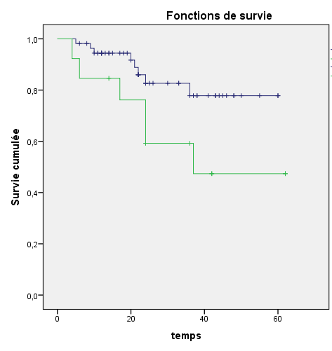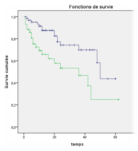 For Rosenthal et al.16, initial local tumor control was 83% for surgery versus 63% for radio-chemotherapy (p<0.007), but after salvage surgery, for 38% of patients with local recurrence the two groups were comparable in terms of local tumor control with a p=0.5.Others obtained the same results but the difference was not statistically significant. Rades et al.17 (75% versus 66% p=0.39), Hsin et al.18 (80% versus 45.2% P=0.105). Both studies found tumor site and tumors volume greater than 15cm³ respectively as factors influencing local control. Nguyen-Tan et al.19 conducted a retrospective study reviewing the records of 223 patients treated for T3-T4 squamous cell carcinoma of the larynx between 1 October 1957 and 1 December 1999. They found that the tumor control rate was better with surgery with 72% locoregional control compared to 43% over 5 years for radio-chemotherapy. For their part, advanced nodal involvement and low hemoglobin level were a poor prognosis for locoregional control.