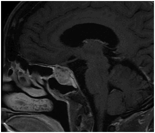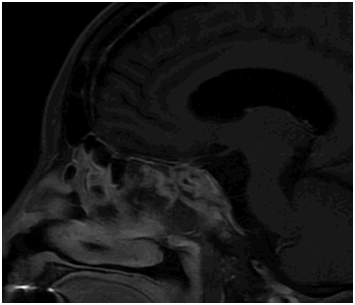 Figure 1 Pre-operative sagittal T1 post-contrast MRI shows a 2.7x2.1x2.0 cm enhancing sellar and suprasellar mass with internal cystic components. There is upward impingement on the optic chiasm and encasement with narrowing of the right cavernous carotid.