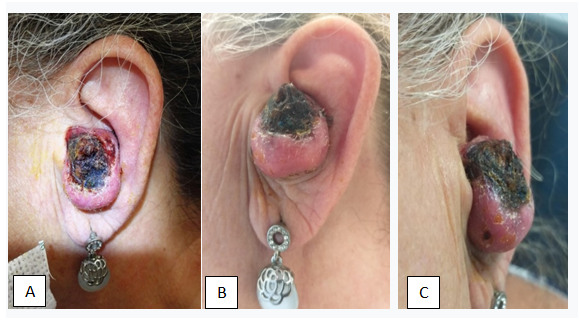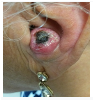 A 71-year-old Portuguese female patient who claims to have a tumor in the left ear, which grows rapidly over a period of six months (2018) in the conchal surface without symptoms or signs of infections, who was treated at the Otolaryngology and Plastic Surgery Department of Luanda Medical Center (Luanda, Angola). The physical examination demonstrates an erythematous conchal cavity tumor, flaky surface and hyperkeratosis area that penetrates the left external auditory canal, without pain nor otorrhea (Figure 1). There is no lymphadenopathy on neck palpation, the patient is scheduled to undergo to a biopsy with local anesthesia.