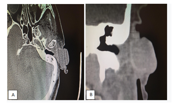 Figure 2 Axial computed tomography, (A) it demonstrated left ear hypodense expansive tissue with inadequate contrast capture. (B) Shows conchal bowl soft tissue that occupies the anterior third of the external auditory canal without bone infiltration.