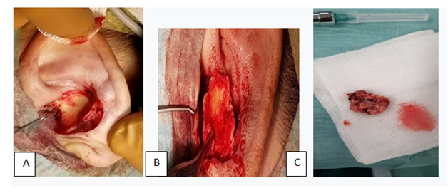 Figure 4 (A) Left ear after tumor resection, cartilage in the background; (B) Left auricular concha cartilage dissected; (C) Left ear concha tumor removed.