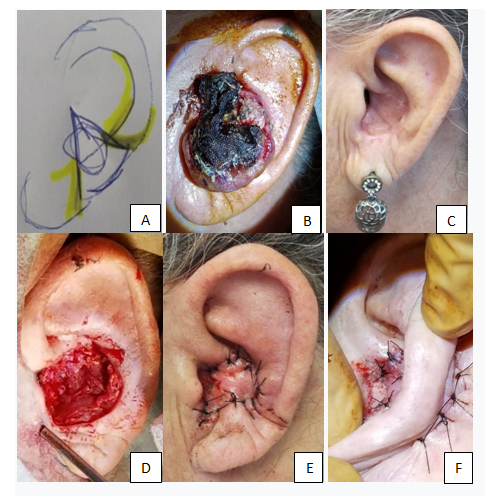 The ear because of its position is susceptible to trauma or exposure to ultraviolet light, this can result in ear damage, these injuries include lacerations, avulsions and cancer. Skin cancer is a frequent pathology, up to 25% of total cancers originate in skin: 90% of them are in the head and neck, and within this location 8% affects the external ear. Cutaneous squamous cell carcinoma (cSCC) is a malignant tumor of epidermal keratinocytes that invades the epidermis; local destruction can be extensive and in advanced stages it can metastasize.1 The external ear includes both the pinna and the external auditory canal (EAC). Squamous cell carcinoma of the pinna (SCCP) is considered a high-risk carcinoma that, because of its specific location, frequently presents recurrence and metastases. Squamous cell carcinoma of the external auditory canal (SCCEAC) is a very rare tumor. Invasion of cartilage by (cSCC) is rare and considered to be a risk factor for the development of metastatic disease.2,3 The National Comprehensive Cancer Network (NCCN) guidelines recommend surgical excision with histologic confirmation of negative margins and close follow-up.2,4